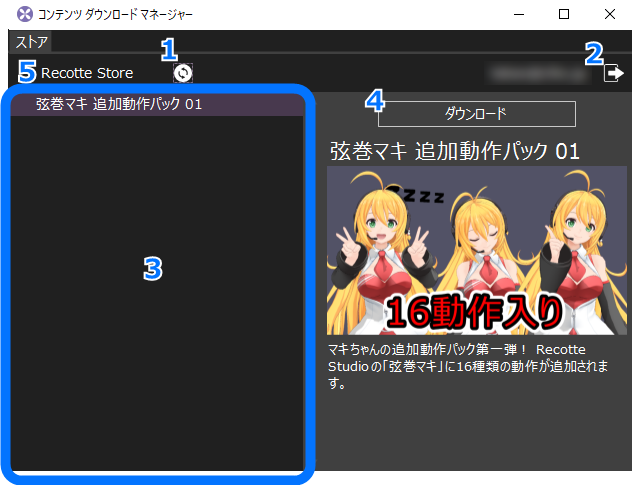 現在のアカウントで所持しているコンテンツのリストが表示されます。 コンテンツ名をクリックすると、左の画面にそのコンテンツの説明が表示されます。